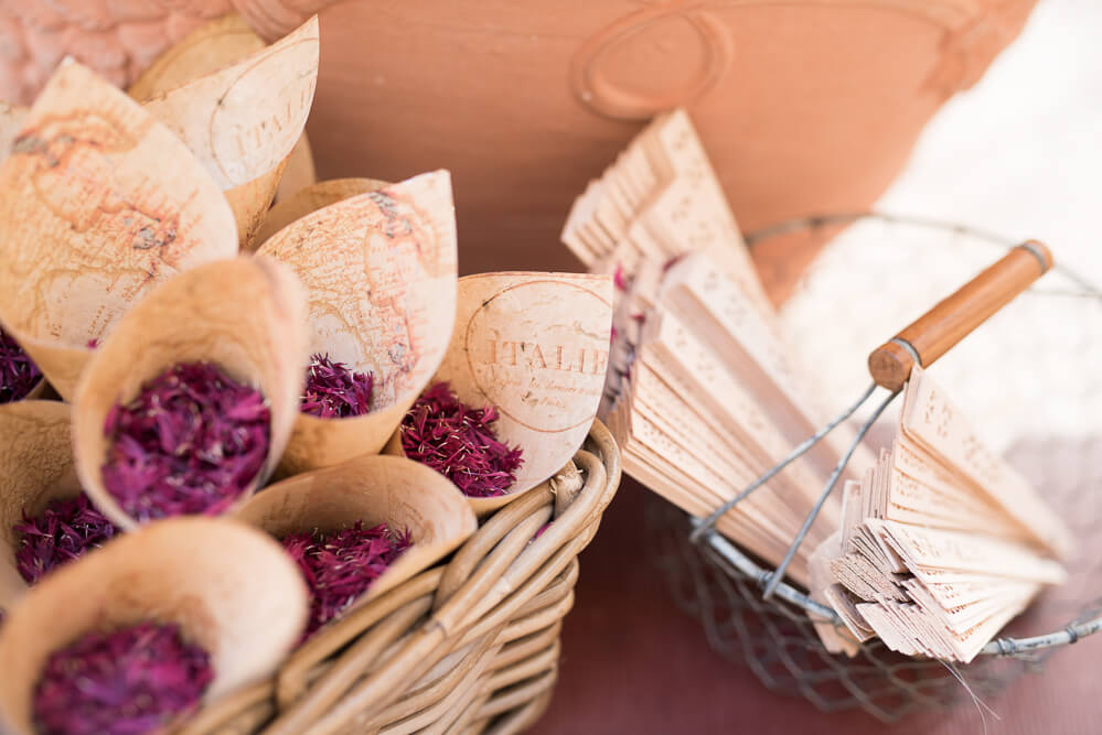 Woven accessories are the perfect way to introduce your guests to your wedding theme. When you send your boxed invitations, include a woven fan for each guest, like a buri fan. This is especially useful for guests who can bring them to venues where they’ll need to stay cool, like outdoor ceremonies in the summer.